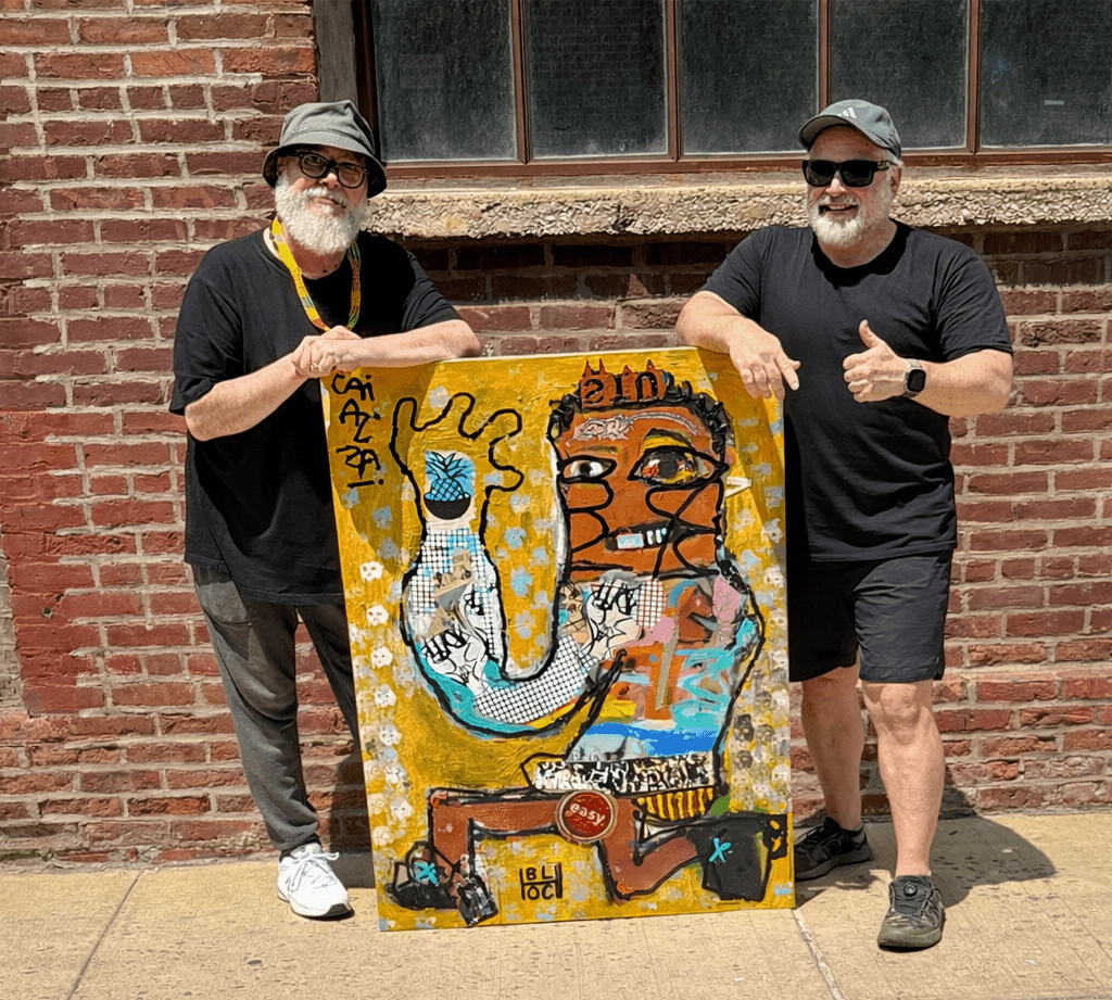 With a background in illustration and fine art, Bloch’s bold linework meets a physical, hands-on process. Surfaces are scraped, cracked, repainted, and rebuilt until they feel tough, lived-in, and human. His work reflects grit, humor, vulnerability, and resilience shaped by the city.