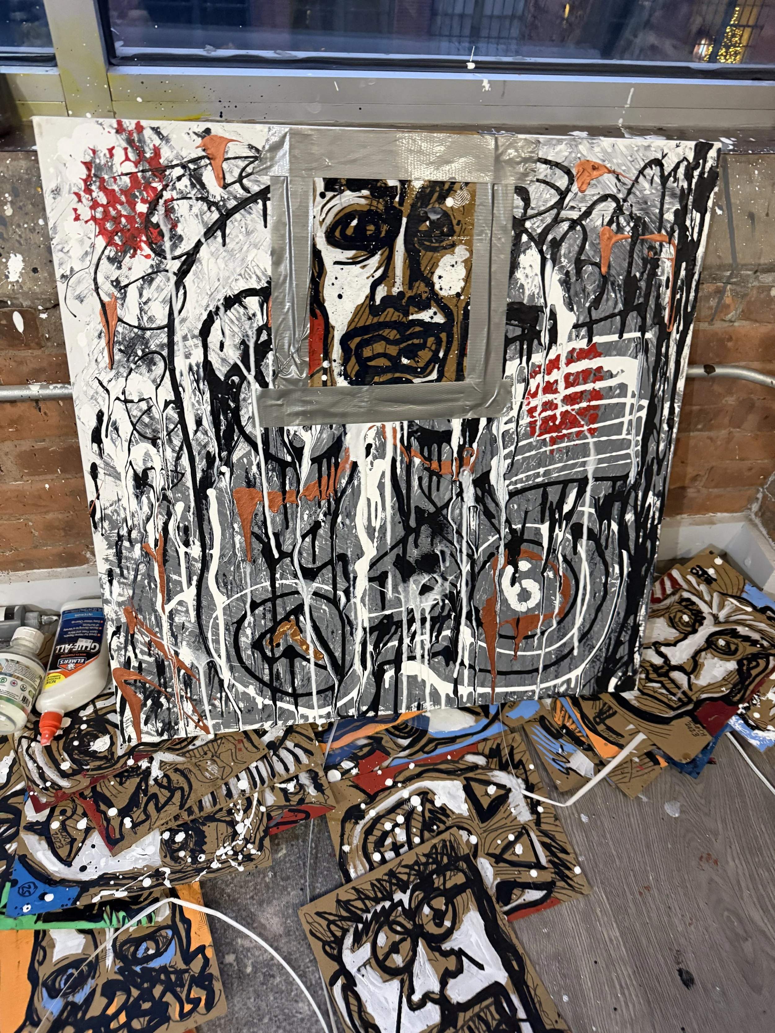 Both artists work physically and intuitively, layering paint, materials, symbols, and emotion into surfaces that feel lived-in and human. The project explores tension and harmony, vulnerability and strength, humor and darkness, a conversation between two artists who share a commitment to authenticity and experimentation.