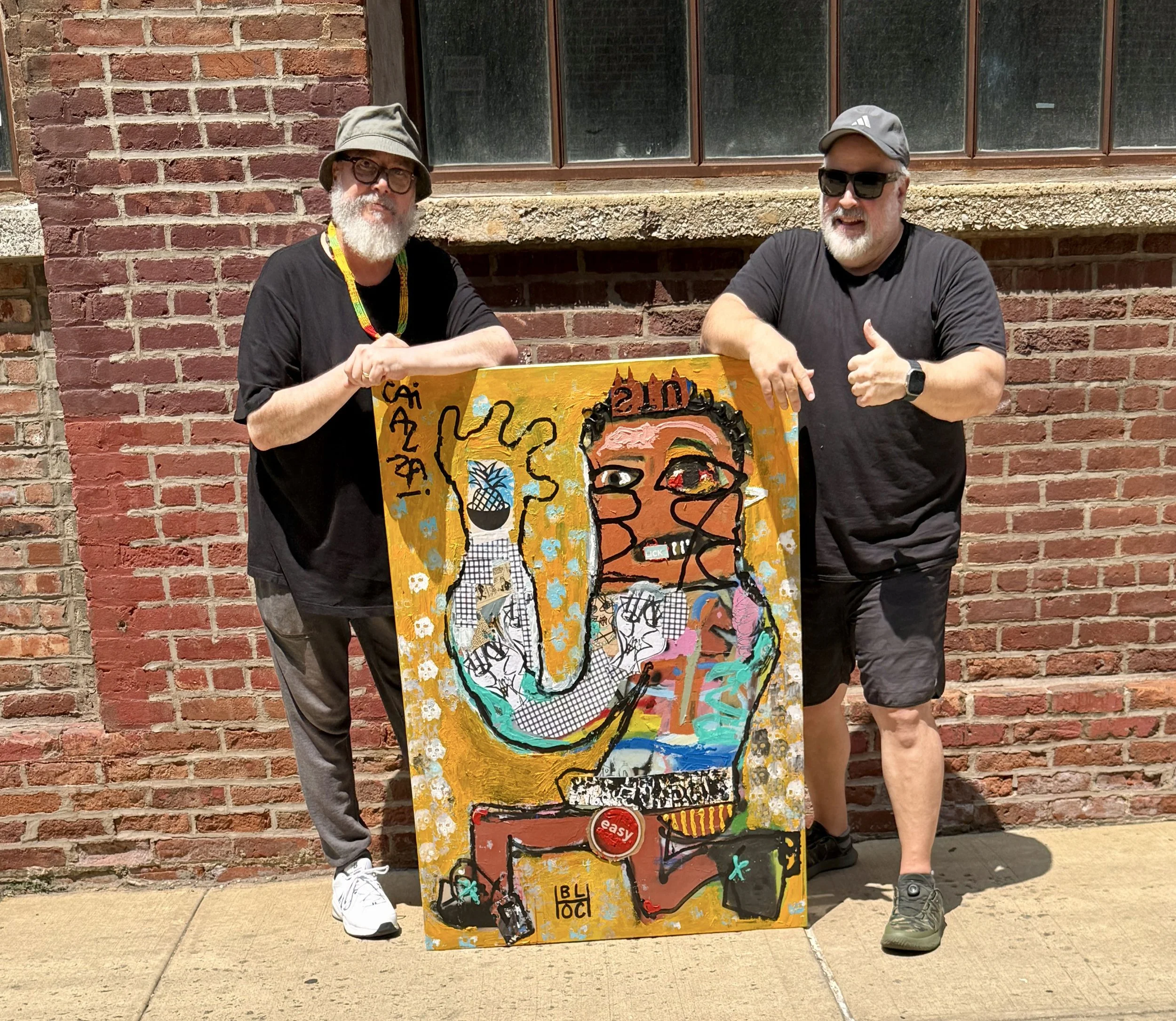 This collaboration brings together two distinct visual languages shaped by different cities, cultures, and emotional landscapes. Joe Bloch’s gritty, architectural surfaces collide with Alejandro Caiazza’s raw, symbolic figures. The result is work that balances structure and chaos, control and instinct, urban grit and childlike imagination.