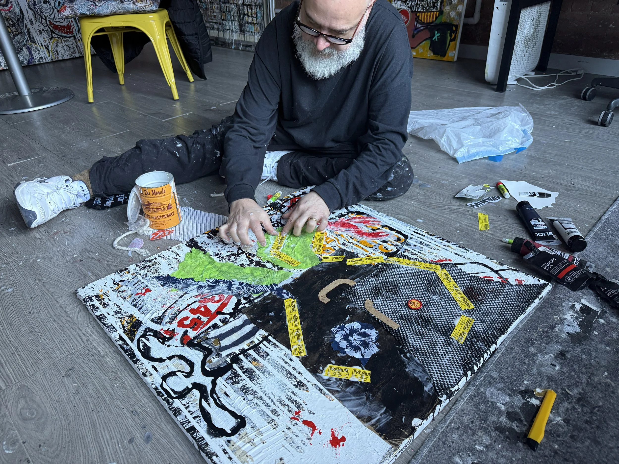 Brooklyn-based artist Joe Bloch creates mixed-media acrylic paintings built from the city itself, part human, part architecture, part worn street surface. His work incorporates real-world materials like cardboard, duct tape, labels, stencils, scraps, and industrial textures.